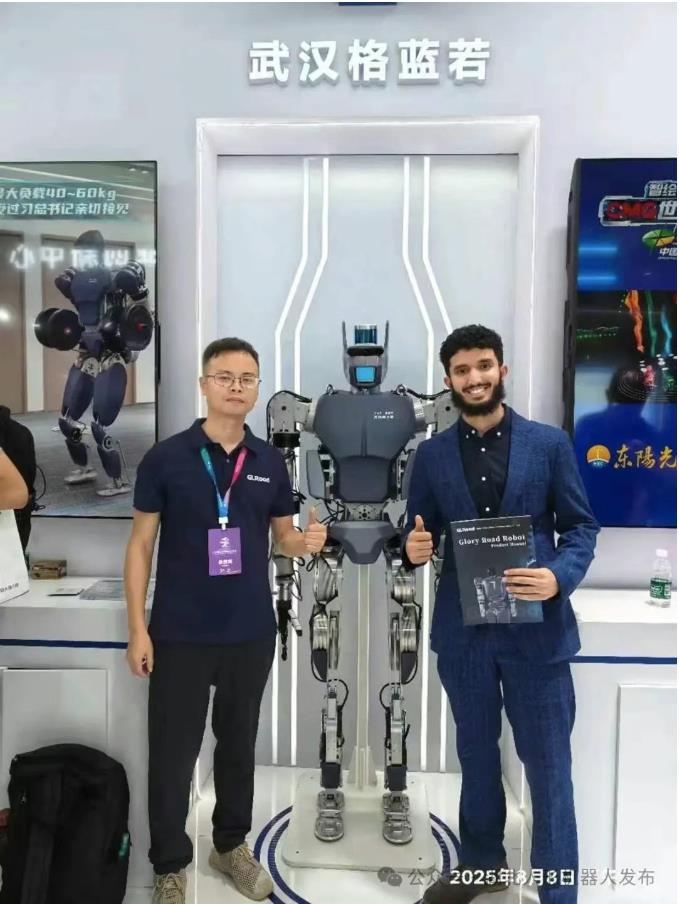 8月8日,在世界機(jī)器人大會上,來自沙特阿拉伯的觀眾在了解到“大壯”雙臂負(fù)載40kg能力后,對機(jī)器人豎起了大拇指。(受訪單位供圖)